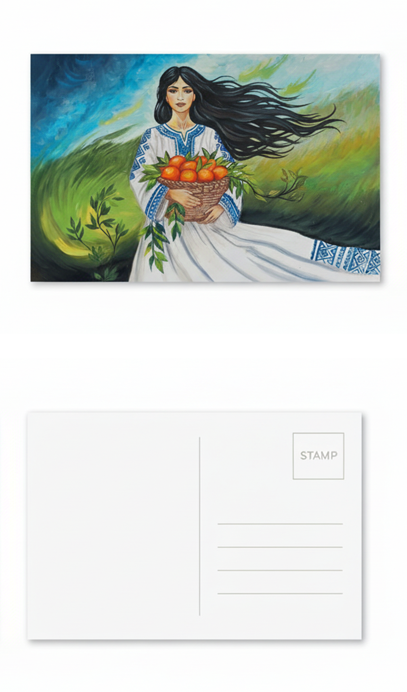 This postcard features a painting by Hadeel Al-Sayed, an artist and mother of two from Nuseirat, Gaza. Her art is born from resilience, created amid war, displacement, and daily struggle.